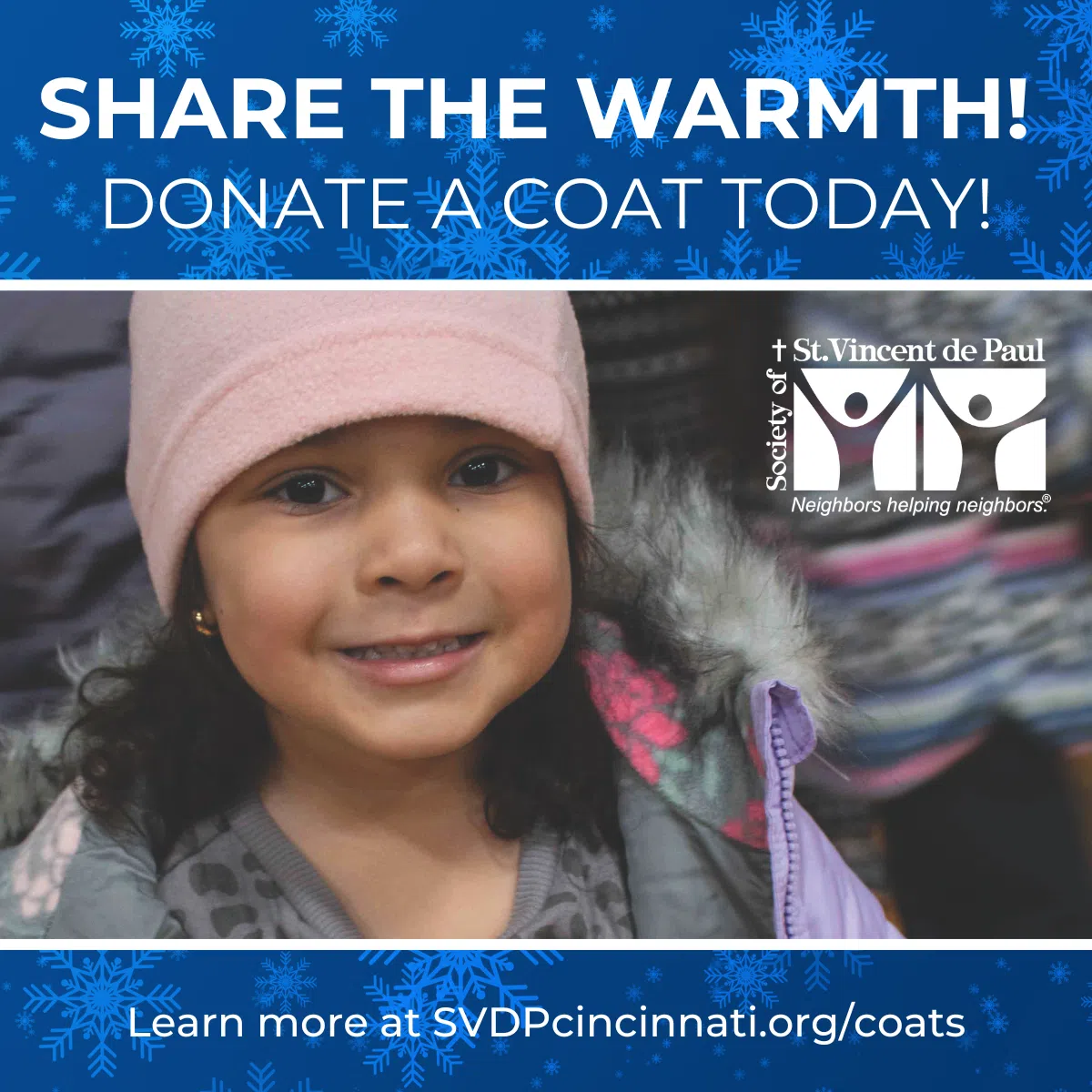 Find drop-off locations, and how to make a monetary donation, and coat distribution dates here. “Share the Warmth” this season with St. Vincent de Paul, WLWT News 5, Gold Star, & Boot Country-Work Country and Cincinnati’s Warm 98.5.